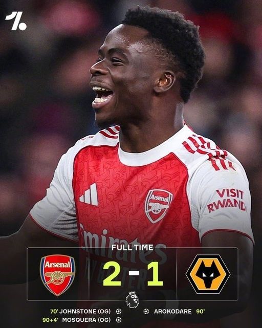 英超第 16 轮的酋长球场,上演了一场充满戏剧性的对决。主场作战的阿森纳历经 90 分钟鏖战,凭借萨卡在角球战术中的两次关键发挥制造对手乌龙,最终以 2-1 补时绝杀垫底的狼队,继续以 36 分的战绩先赛一场领跑积分榜。
