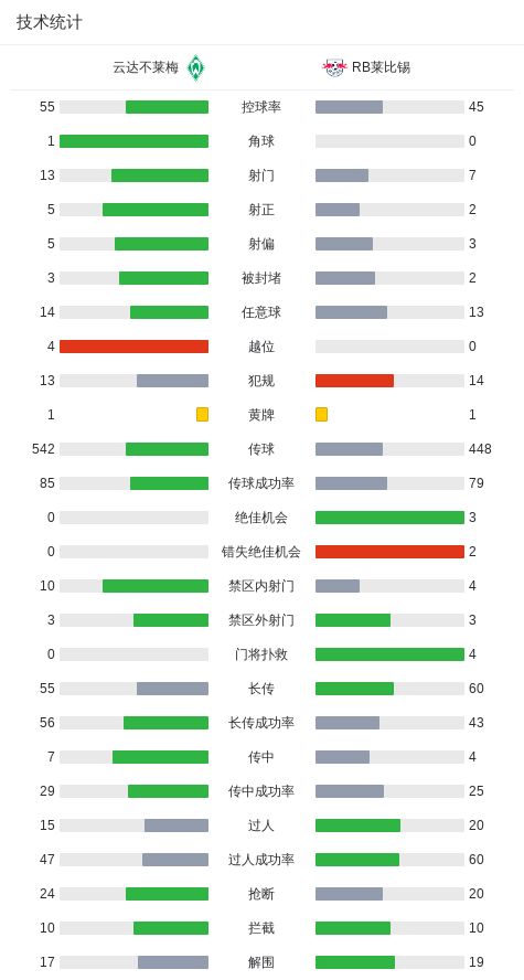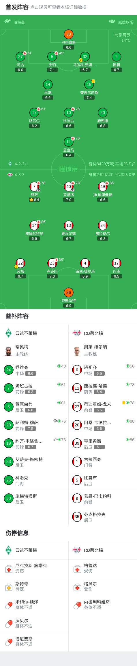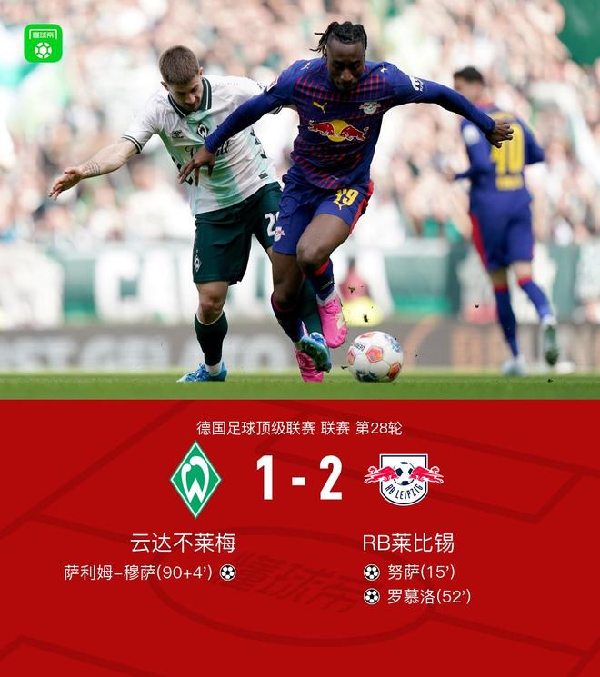 北京时间4月4日德国足球顶级联赛第28轮,云达不莱梅主场对阵RB莱比锡。。努萨、罗慕洛分别破门。萨利姆-穆萨扳回一城。最终比分云达不莱梅1-2RB莱比锡。